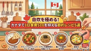 カナダ生活役立ち情報 自炊を極める!カナダで1日食費$10を抑える節約レシピ5選 カナダの物価高に驚いていませんか?留学生やワーホリ勢必見!自炊で食費を抑えるためのスーパーの選び方、カナダの自社ブランドの活用法、そして安価なドラムスティックやレンズ豆を使った節約神レシピ5を徹底解説します。賢く自炊してカナダ生活を楽しみましょう。 2026.03.16 カナダ生活役立ち情報レシピ
